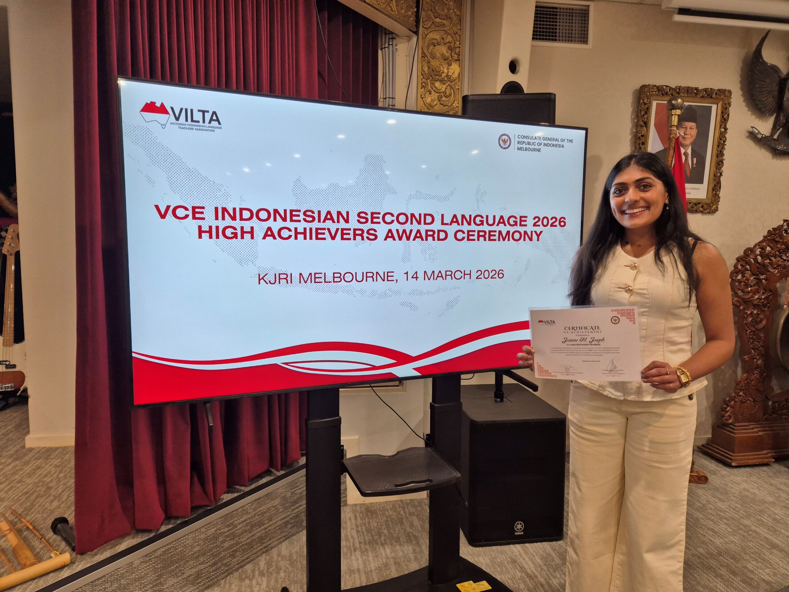 Joanne Joseph (2025 Graduate) received a raw study score of 40 for Indonesian Second Language VCE in 2025. On 14 March 2026, Joanne was invited to attend a Celebration of Excellence Ceremony at the General Consulate of the Republic of Indonesia, organised by the VILTA (Victorian Indonesian Language Teachers Association), attended by the Consul General, Yohanes Jatmiko Heru Prasetyo. This achievement placed Joanne among 28 students across Victoria who received raw scores of 40 and above. To be recognised at this level is a testament to the hard work and commitment Joanne has brought to her studies throughout her VCE journey.