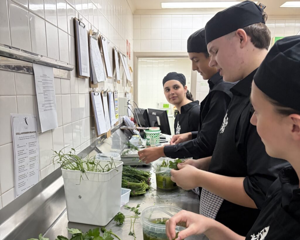 Led by the Year 12s, the students worked in small teams to prepare and set the long table for 140 people, then served and cleared a three-course meal for guests. A small team of students was also fortunate enough to work under the guidance of Executive Chef Chris Timmins, preparing and plating each of the dishes served.