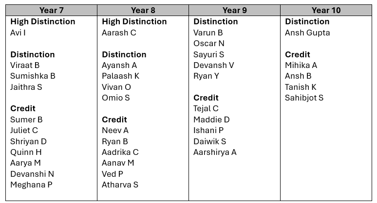 We would like to acknowledge all of the students who participated and recognise those who performed particularly well: