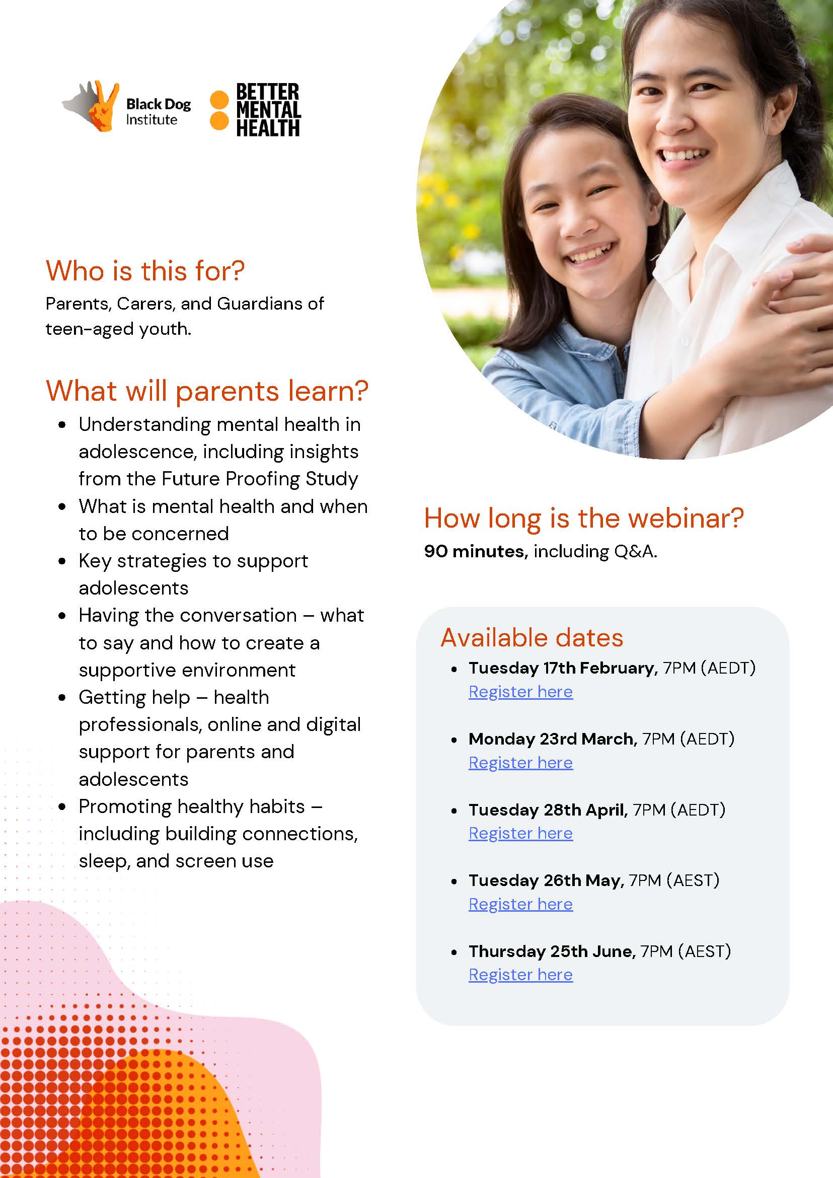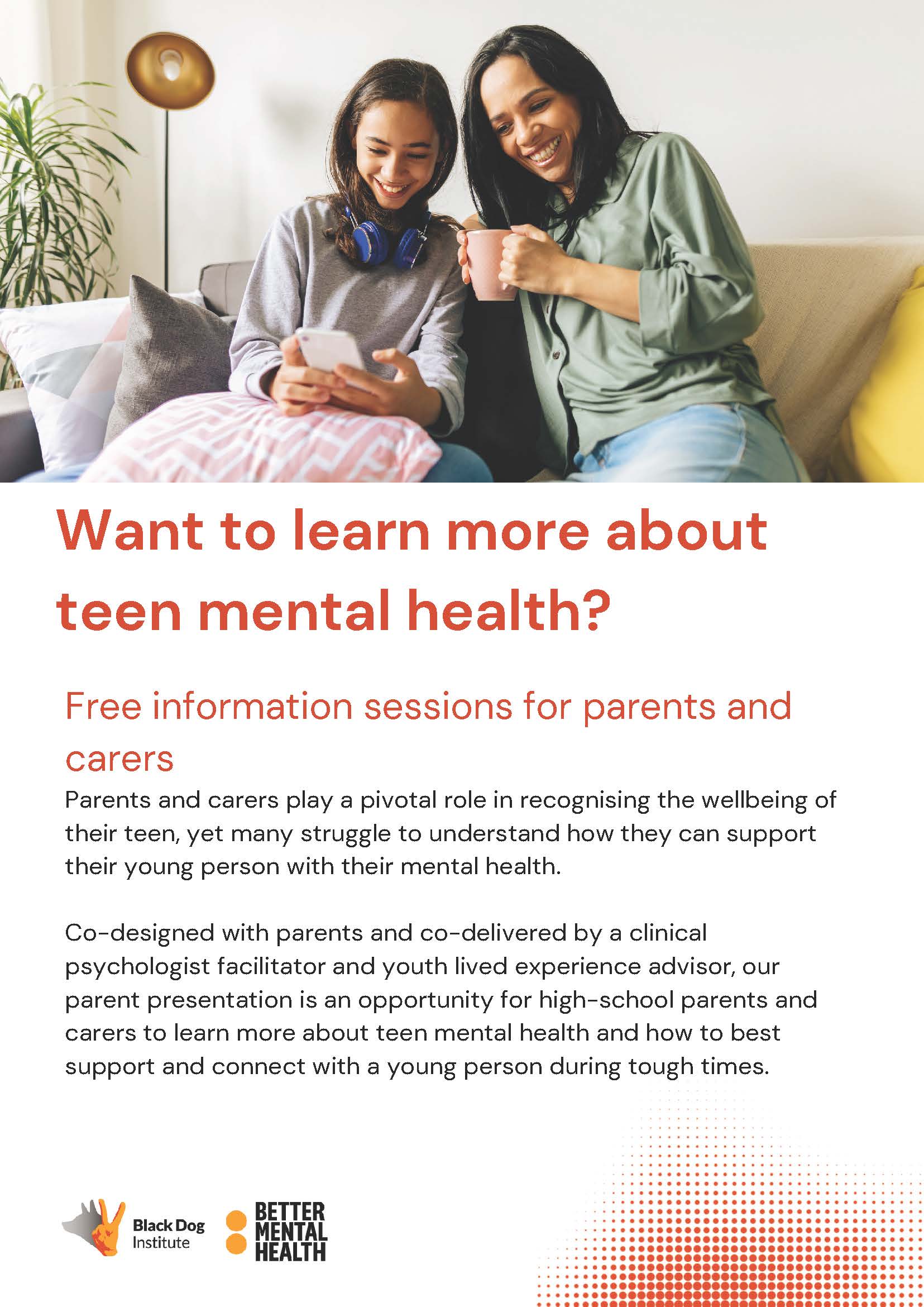 The Black Dog Institute is offering parents and carers the opportunity to engage with a series of free webinars from March to June focusing on understanding mental health in adolescence, key strategies to support mental health, how to have supportive conversations and promoting healthy habits.